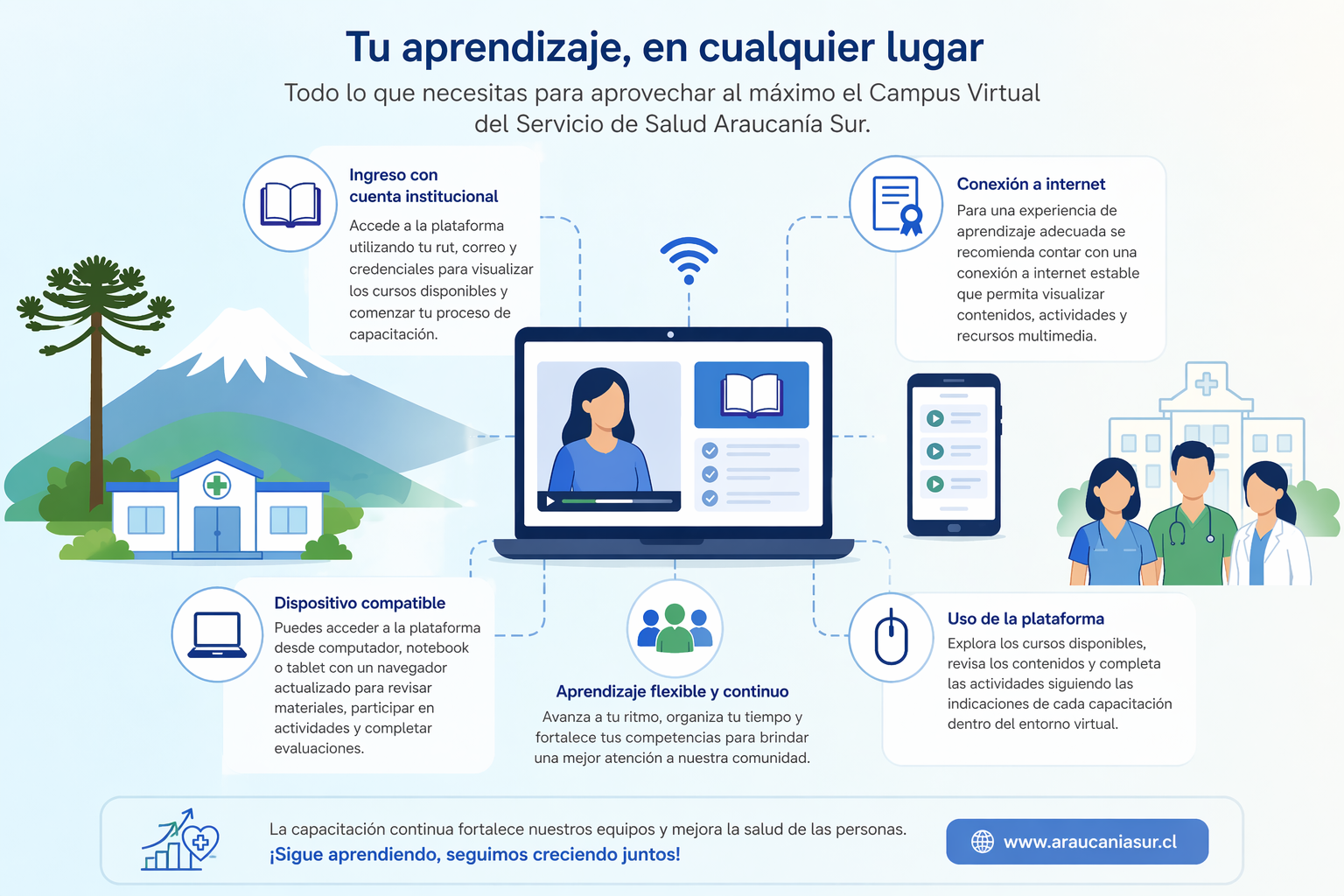 El Campus Virtual refleja el compromiso institucional con la innovación, la modernización y el fortalecimiento del capital humano. Cada curso realizado representa una oportunidad para optimizar procesos, enriquecer la atención usuaria y aportar al bienestar de las personas y territorios de la Región de La Araucanía.